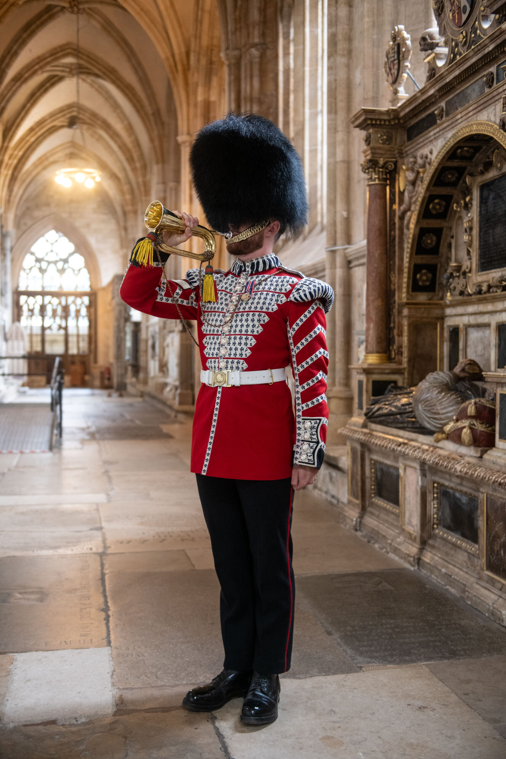 Before the conclusion of proceedings, which included the hymns, Praise my Soul the King of Heaven, We Plough the Fields and Scatter and I Vow to Thee My Country, Lance Corporal Thomson, a bugler of the Coldstream Guards, played the Last Post and Reveille.