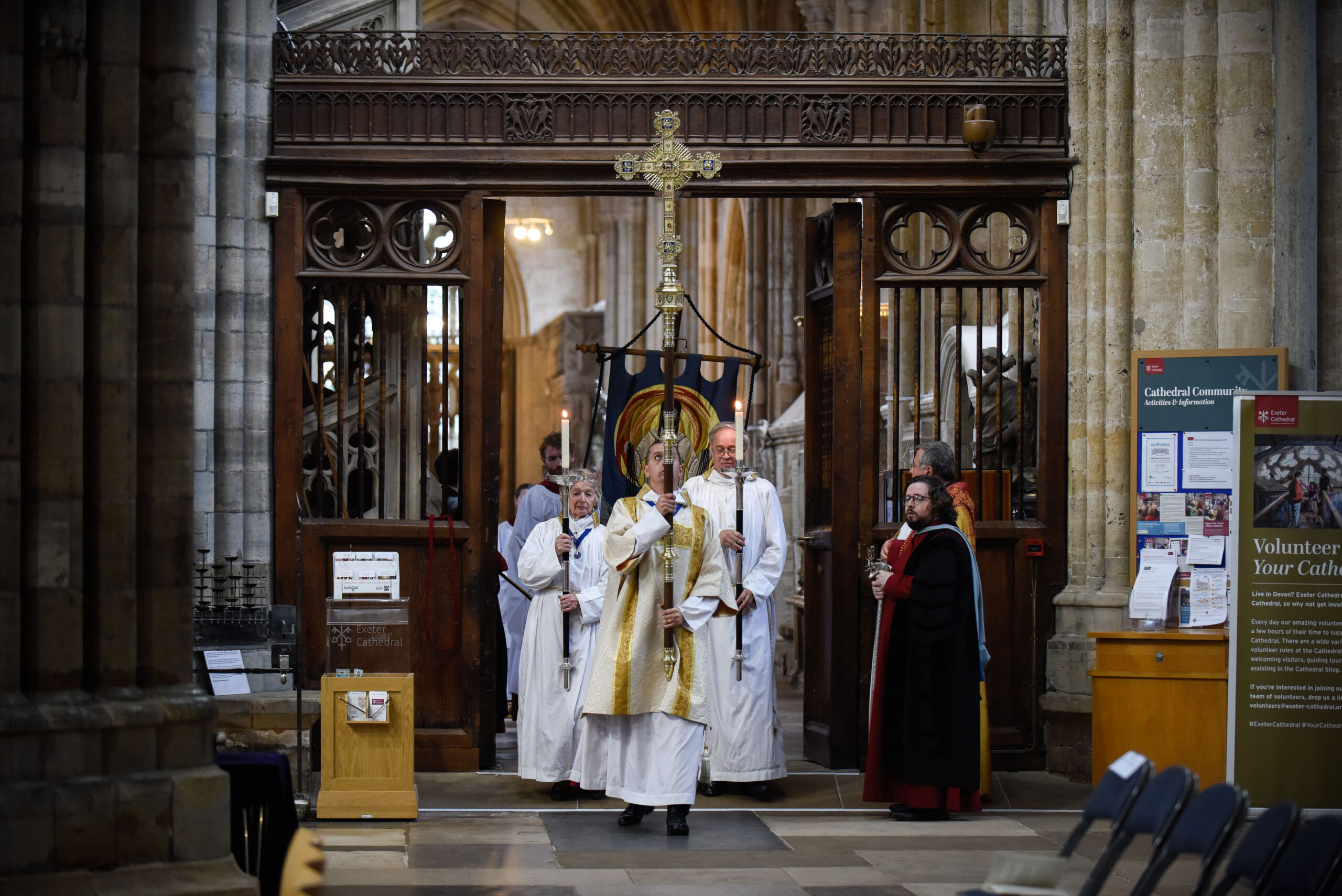 The spectacular Clinton Cross, given to Exeter Cathedral by the 20th Baron Clinton as a symbol of his gratitude for his son’s safe return from the Anglo-Boer War in South Africa, was carried into the cathedral at the start of the service.